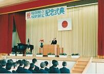 5/1(火)に創立記念式を実施しました。本校は今年度で創立36年目を迎えています。式では「校章と校歌ができるまで」について、校長講話がありました。左下の写真は1985年(昭和60年)4月28日に校章と校歌が制定されたことを記念して開催された式典の様子です。