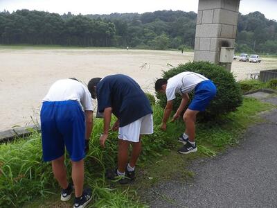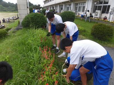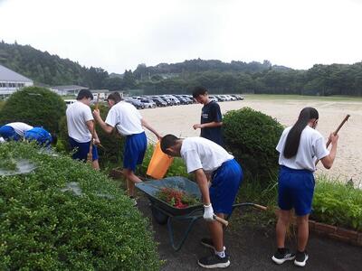 5日(土)に2学年の生徒と保護者による奉仕活動を実施しました。校舎前の除草を中心に行い、保護者の方も、生徒達も一生懸命によく活動していただいたおかげで、きれいになりました。暑い中大変お世話になりました。ありがとうございました。また、地域のボランティアの方が来てくださり、除草のお手伝いをしてくださいました。ありがとうございました。