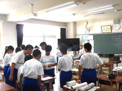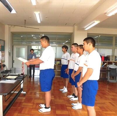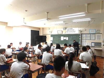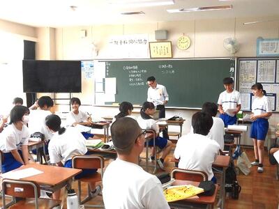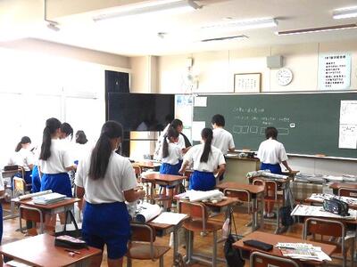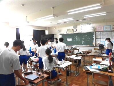 夏休みが終わり、本日から学校が再開されました。生徒達の元気な声が学校に戻ってきてとてもうれしく思います。朝には、全校集会をオンラインで行い、表彰等を行いました。1校時には学活を行い、夏休みの課題等提出物を集めている姿が見られ、2校時からは通常授業が始まりました。生徒達は、元気に活動しています。