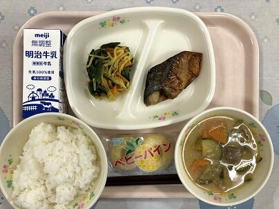 ごはん、牛乳、焼き魚(さば)、もやしのカレー和え、豆乳入り夏野菜汁、冷凍パイン