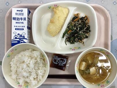 わかめごはん、牛乳、手作りからあげ、野菜と卵の中華和え、えのきの味噌汁