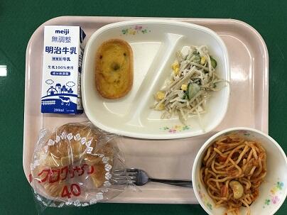 夏野菜のスパゲッティ、牛乳、カボチャグラタン、ごぼうサラダ、クロワッサン
