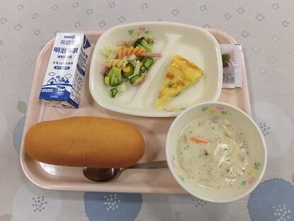 コッペパン、とちおとめいちごジャム、牛乳、スペイン風オムレツ、花野菜とパスタのサラダ、クラムチャウダー