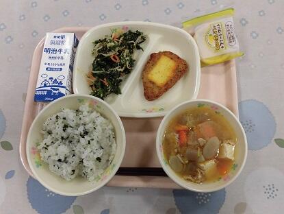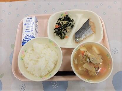 ごはん、牛乳、焼き魚(鰆のスタミナ漬け)、磯辺和え、けんちん汁