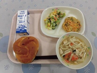 米粉チーズパン、牛乳、野菜かきあげ、コーンサラダ、煮込みうどん