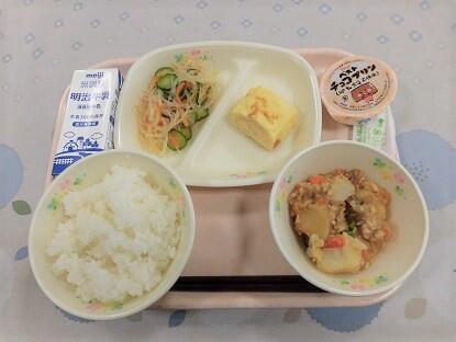 ごはん、牛乳、厚焼きたまご、中華風春雨サラダ、じゃがいものそぼろ煮、チョコプリン
