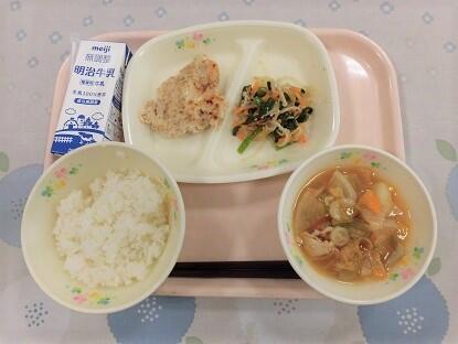 ごはん、牛乳、とりにくのごま味噌焼き、にらの和風和え、キムチとん汁