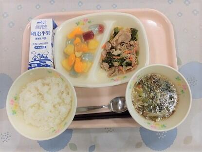 ごはん、牛乳、ぶたニラ炒め、沖縄もずくの中華スープ、フルーツのゼリーあえ