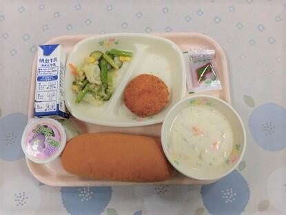 県産小麦のコッペパン、とちおとめジャム、牛乳、あさのメンチカツ、アスパラサラダ、クラムチャウダー、県民の日ゼリー