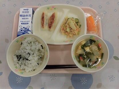 わかめごはん、牛乳、焼きギョウザ、切り干し大根の中華サラダ、にらとかんぴょうのかきたま汁、カットオレンジ