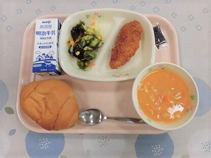 バターロールパン、牛乳、白身魚のフライ、海草サラダ、トマトクリームシチュー