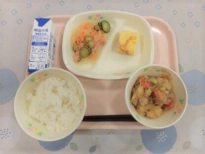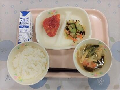 ごはん、牛乳、からあげ薬味ソースかけ、野菜と卵の中華和え、かんぴょうの味噌汁