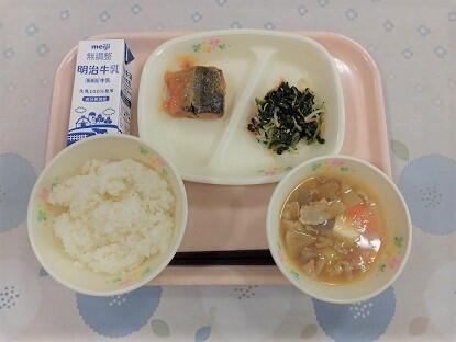 ごはん、牛乳、煮魚(サバの味噌煮)、ほうれんそうのごまあえ、とん汁
