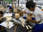 技術科の授業は理科室を使って行っています。教室を訪ねたときは、1年生の授業で木工作品を作っていいました。手狭な空間のなかで、工具を使いながらの力作が多く見られました。なお、大規模改修中は本来の技術室は各階の工事に合わせて、備品の搬入や搬出のための物置になっているため、改修工事が行われるのは最後になります。