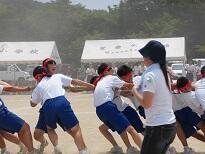 写真は3年団体「応援綱引き」の様子です。綱引きは単純な競技ですが、これほどやっている生徒も見ている人も力が入る種目はないと思います。写真からも力の限りを尽くして綱を引く様子や一刻も早く応援に入ろうとする様子が伝わってきます。担任の先生も力が入っていますね。今年度の綱引きは3回戦行われました。1勝1敗で迎えた3回戦は最後の力を振り絞っての激闘でした。