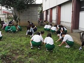緑化委員会では、中庭の学級花壇の除草を行いました。