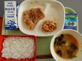 献立は、ごはん、チキン竜田揚げ、じゃがいものみそ汁