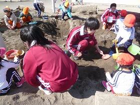 寒空の下、中学生と園児が一緒に楽しそうに過ごしていました。