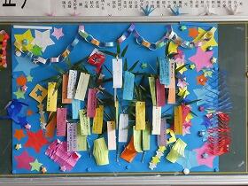教室や図書室には、各クラスで工夫を凝らした七夕飾りが飾ってあります。