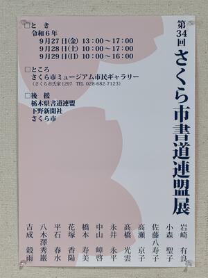 さくら市ミュージアム市民ギャラリーで、1年生の書写(書道)の授業で外部講師として御指導いただく花塚先生の書が展示されています。