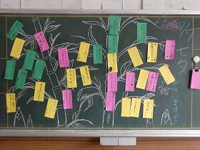 教室や図書室には、各クラスで工夫を凝らした七夕飾りが飾ってあります。