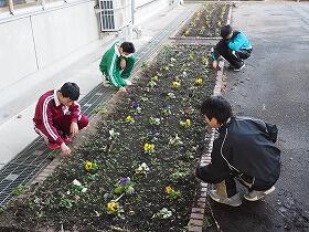 緑化委員会では、中庭の学級花壇に植えたパンジーの手入れを行いました。