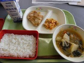 じゃがいもとわかめのみそ汁 しもつかれ 牛乳 です。