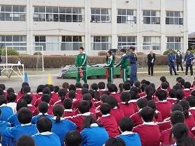 その後、第3学年の代表が消火器の使い方の実演をするのを