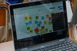 4年生は、ロイロノートを使って、メモを提出箱に入れて全員のメモをモニターで映し出していました。