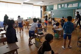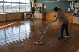帰る時に、床を掃き、水拭きしました。「1・2・3・4……」と声を合わせて床を拭いていました。下校後は職員が手際よくワックスをかけていました。例年は長期休業の前に行っていましたが、今年はコロナの影響で今回が初めてになります。1年生も元気に床を拭いていました。