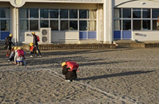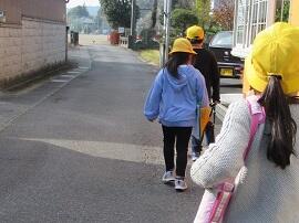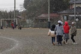 上学年の下校の様子です。早く校庭に出た子は、全員が揃うまで待っています。今日は冬至なので、子どもたちの影が長く伸びています。