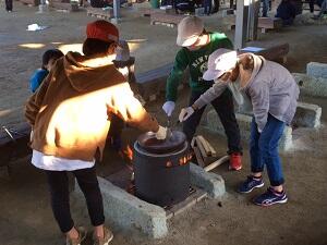 塩づくりです。煙はけむいし、火は熱いし、土鍋はススだらけで大変ですが、海浜自然の家の名物イベントです。