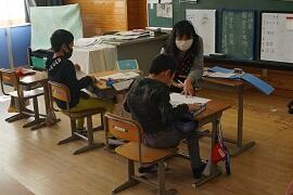 1年生は、自分の好きな自動車を紹介する文を作っていました。学力向上推進リーダーを含めて3人の教員で教えていました。