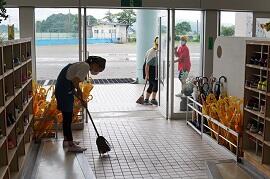 清掃の時間は来週からなので、教職員が清掃をしています。清掃を終えてから消毒しています。