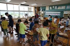 昨日、生活科で水辺の生き物をとってきた2年生が、水槽の水を交換していると、1年生が寄ってきました。好奇心旺盛な1年生です。虫が好きな1年生もいるようです。