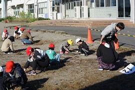 5年生は、「平均を生活に生かそう」というめあてで、校庭で歩数からおよその距離を求めていました。