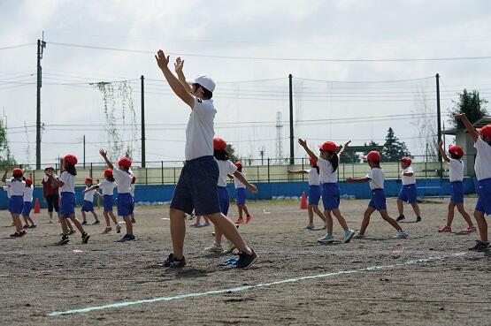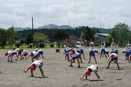 最後に準備運動をしました。指揮者は号令を出しますが、児童はかけ声を出さないで運動する練習をしました。