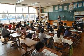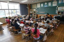 1年生は算数でドリルをしようとしています。3年生は「2.8はどんな数といえるかを考えよう」との本時のめあてを確認中でした。