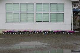 サイネリアをパソコン室の外に並べました。この鉢植えは、卒業式でステージに飾り、春休みに教職員が交代で水やりをし、入学式でもステージに飾りました。この後、各クラスに配布し、教室で飾るのが例年でした。今回は臨時休業なので、教室に飾っても子どもたちがいないので、外に飾り、散歩する方や来校する方に見ていただこうと、ここに置くことにしました。少しはなごんでもらえればと、思います。