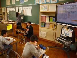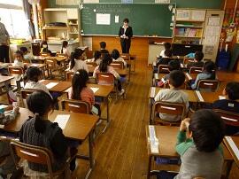 1年・生活:つくった名刺で自己紹介遊び 2年・国語:グループで音読して感想を交流