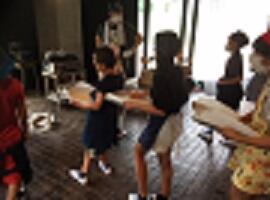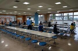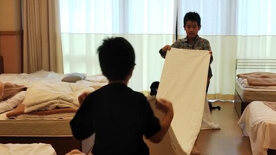 6時に起きると、さっそく掃除や片付けをしていました。シーツは大きいので、協力してたたんでいました。健康観察では、全員元気です。