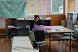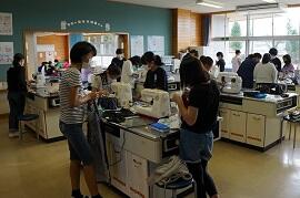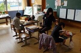 6年生は、家庭科室でミシンの学習でした。密を避けるため、ランチルームでミシンを使っているグループもありました。