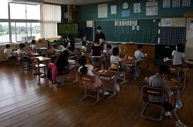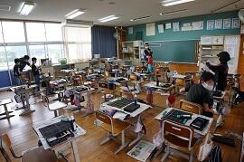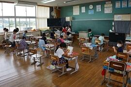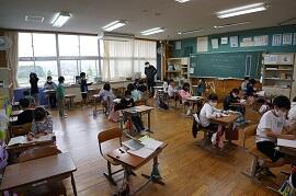 8時5分頃の教室の様子です。月曜日の朝は、荷物が多く、片付けが大変です。でも、1年生も6年生も、みんな荷物をロッカーにしまい、連絡帳や検温カード、宿題を提出しています。早く片付けた子は、友だちや先生と話をしたりしていました。8時10分から読書が始まりますが、もうすでに読書をしているクラスもありました。