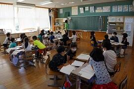 1年生は、「しらせたいな、見せたいな」で、校庭で見つけた物を文で表す勉強でした。においや手触り、形、大きさを文で表します。生活科と関連しています。3年生になると、理科で四季の動植物を記録する「見つけたカード」の学習につながります。学力向上推進リーダーも含めて3人で指導していました。