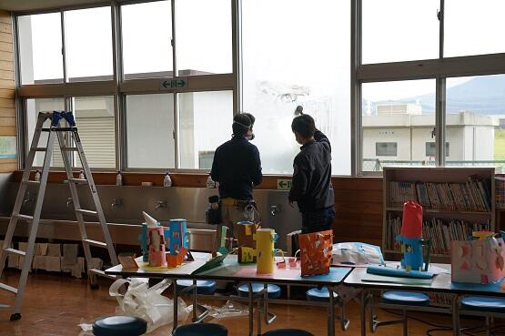 風が強かったため、高所作業車が揺れたり、フィルムが風にあおられたりして大変だったようです。夕方にはきれいになりました。