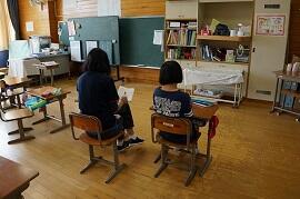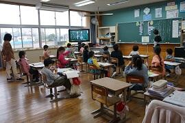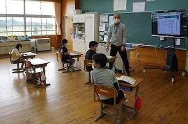 2組と3組は個別学習でした。3組は、デジタル教科書を使って、「夕日が背中を押してくる」を音読させていました。