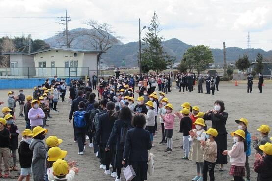 校庭では、大声を出せないため、拍手を精いっぱい送っている在校生の姿が印象的でした。兄弟げんかをしていた弟さんや妹さんも、今日ばかりは、感謝が拍手に込められているようでした。