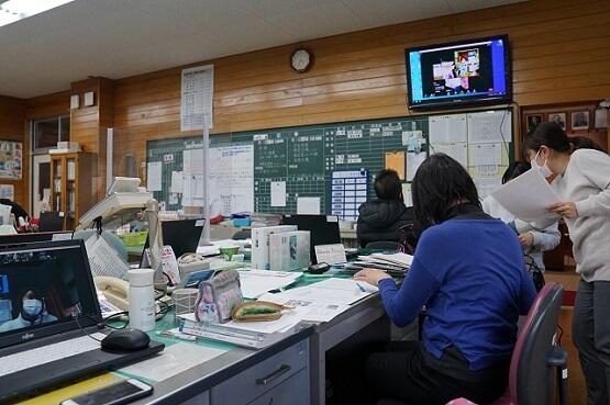 研究授業に向け、指導者である大学教授の先生から指導を受けています。今回はZoomで研修しました。町内の小学校の先生も参加しました。皆さん熱心で、活発に意見を交わしていました。