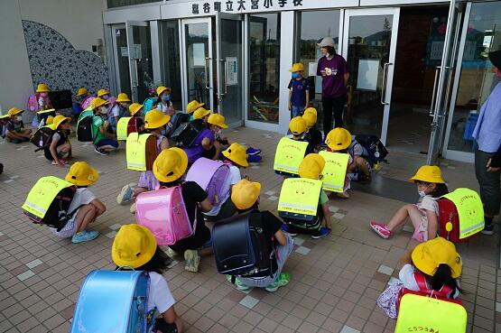 今日から、1・2年生の下校が始まりました。暑かったので、昇降口の前で集まりました。