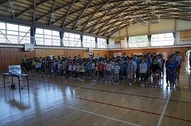 今朝の朝会は壮行会をしました。明日開催予定の第93回塩谷町小学校陸上競技大会に出場する5・6年生に、より一層がんばってもらうために開きました。最初に、選手の代表児童があいさつをして、その後1~4年生の児童が校長の指揮でエールを送りました。今後の人生でも、面接や受験など緊張する場面はたくさんあると思われます。その緊張する中でも、自分の体と心をうまくコントロールして、その結果、練習より良い記録が出せれば最高ですね。